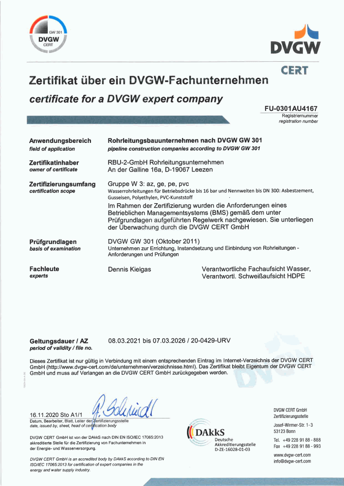 Rohrleitungsbauunternehmen nach DVGW GW 301